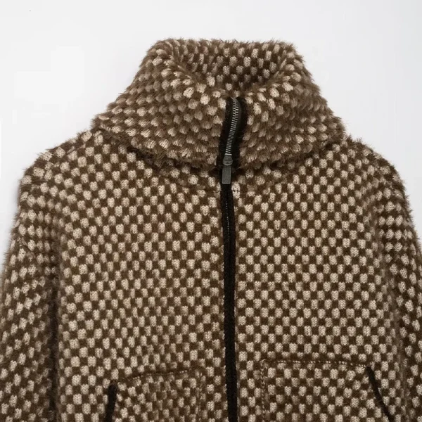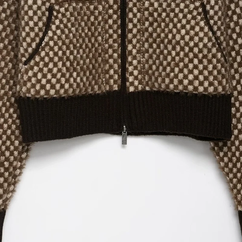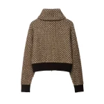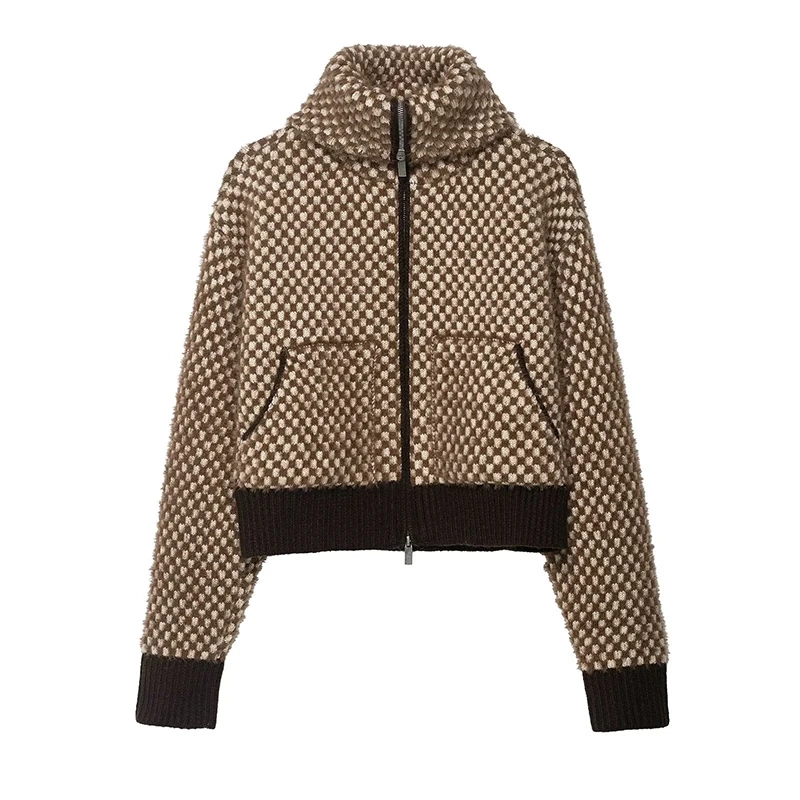Willshela Women Fashion With Pockets Plaid Knitted Front Zipper Jackets Vintage High Neck Long Sleeves Female Chic Lady Outfits
