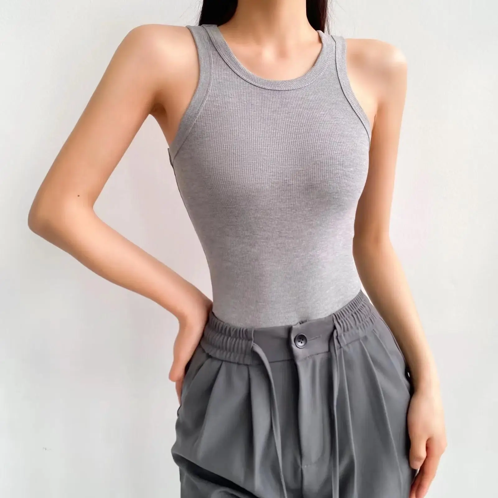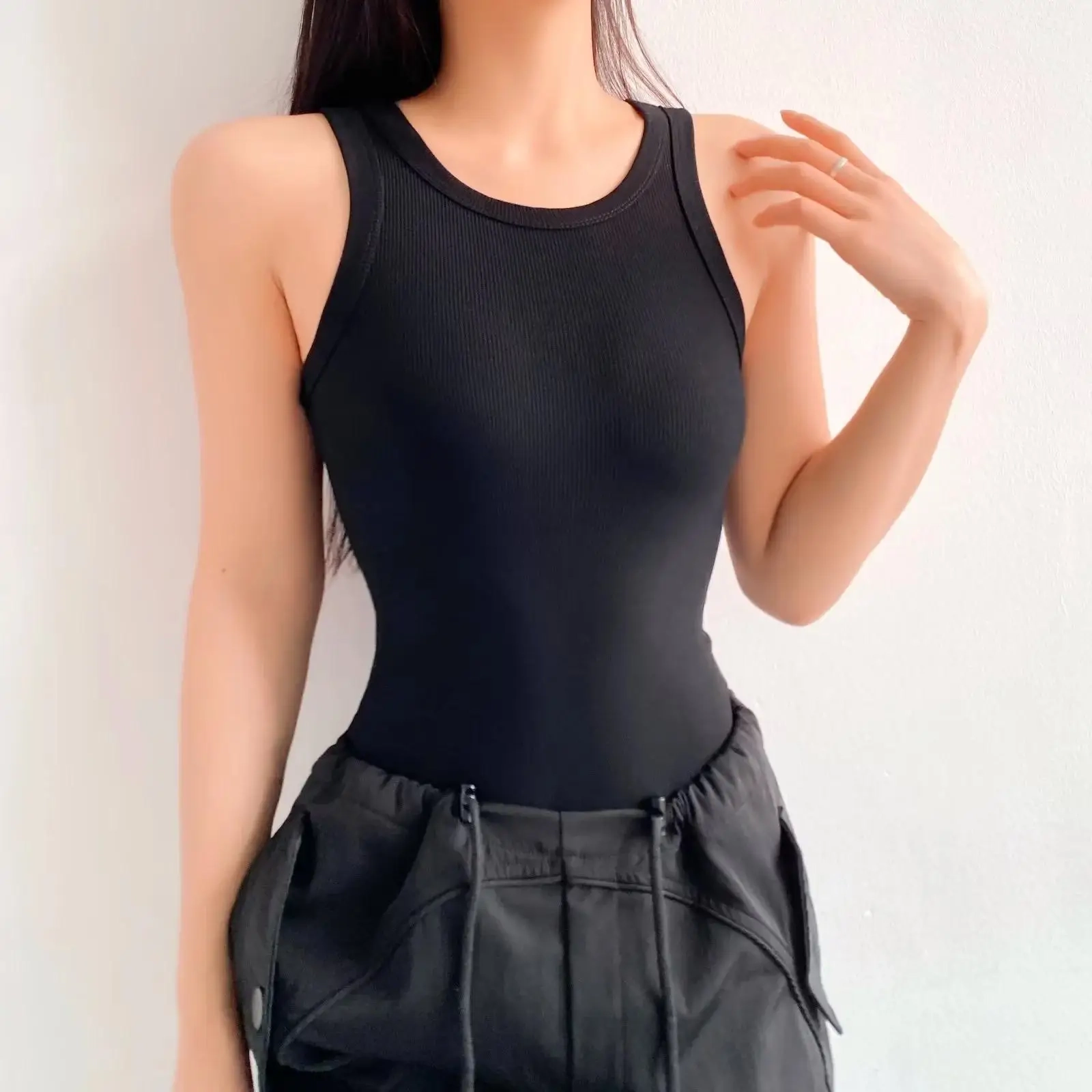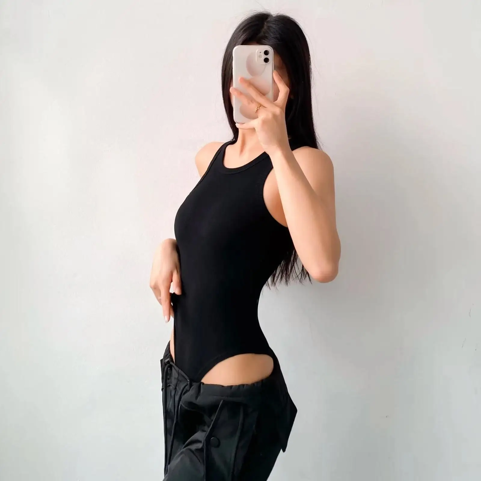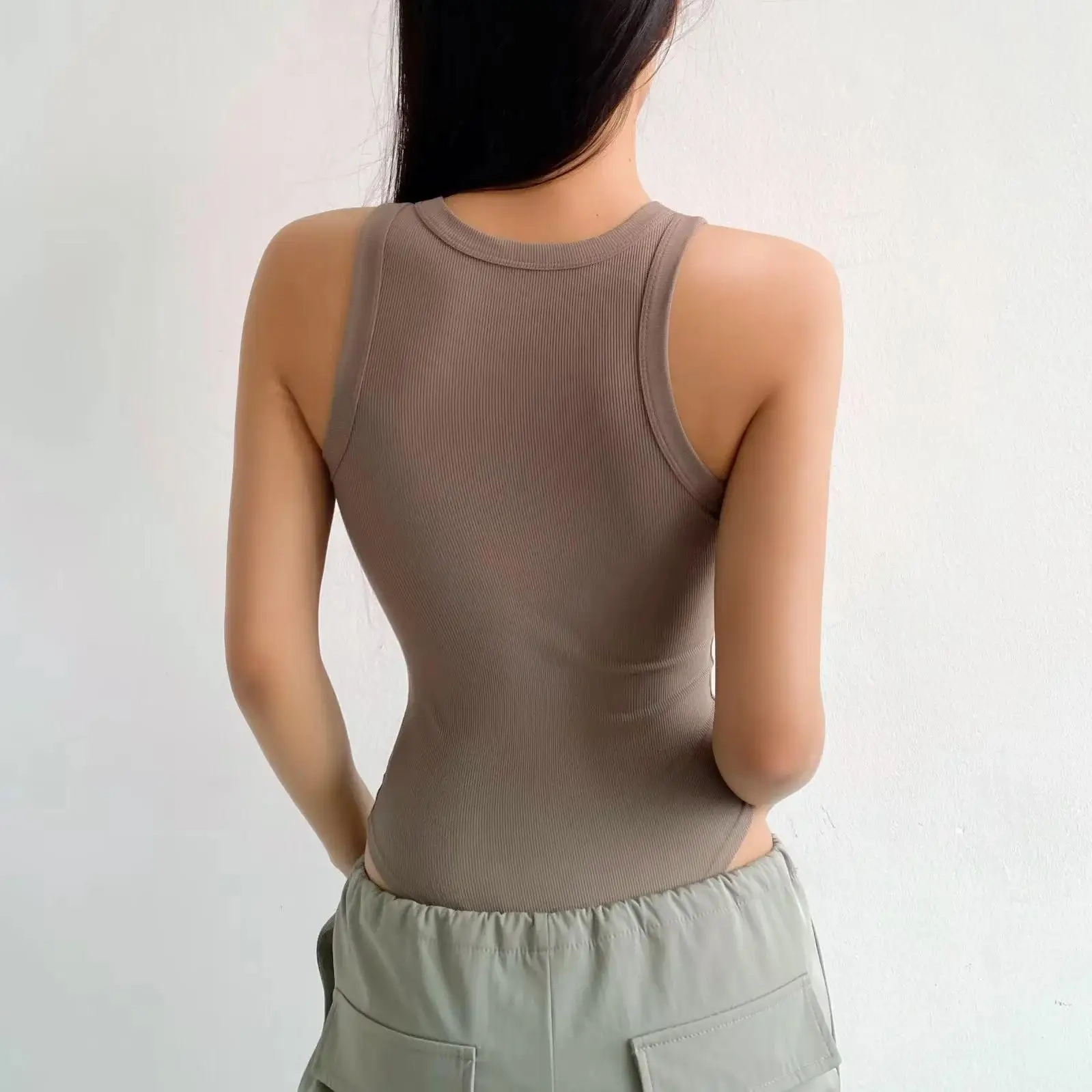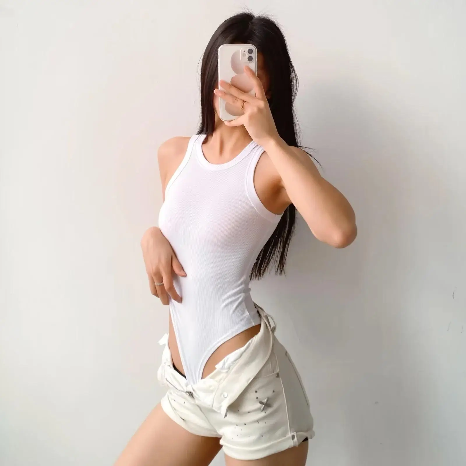 Women Rib Knit Sleeveless Bodysuits Summer Solid Color Elastic Slim Top Jumpsutis