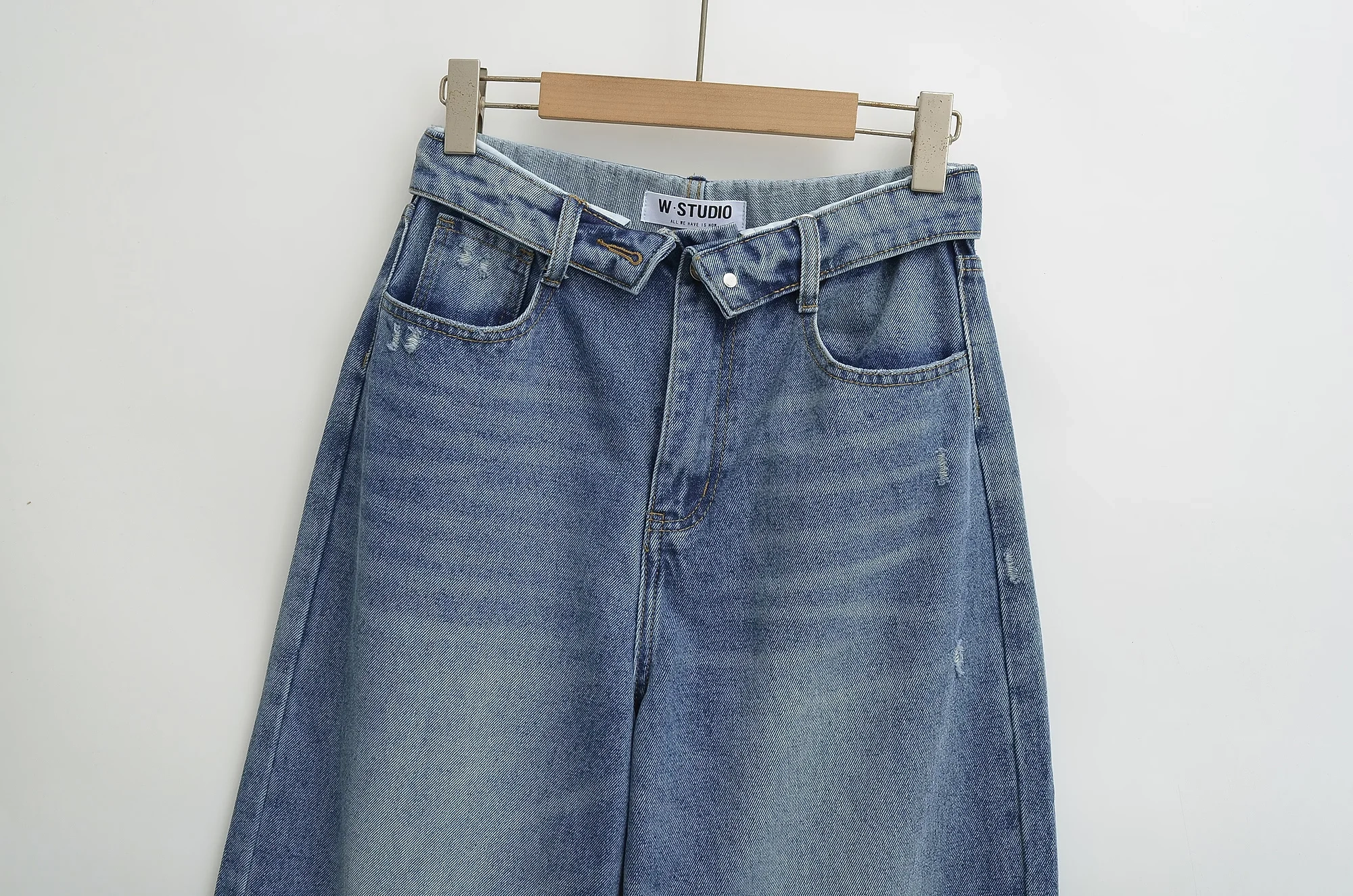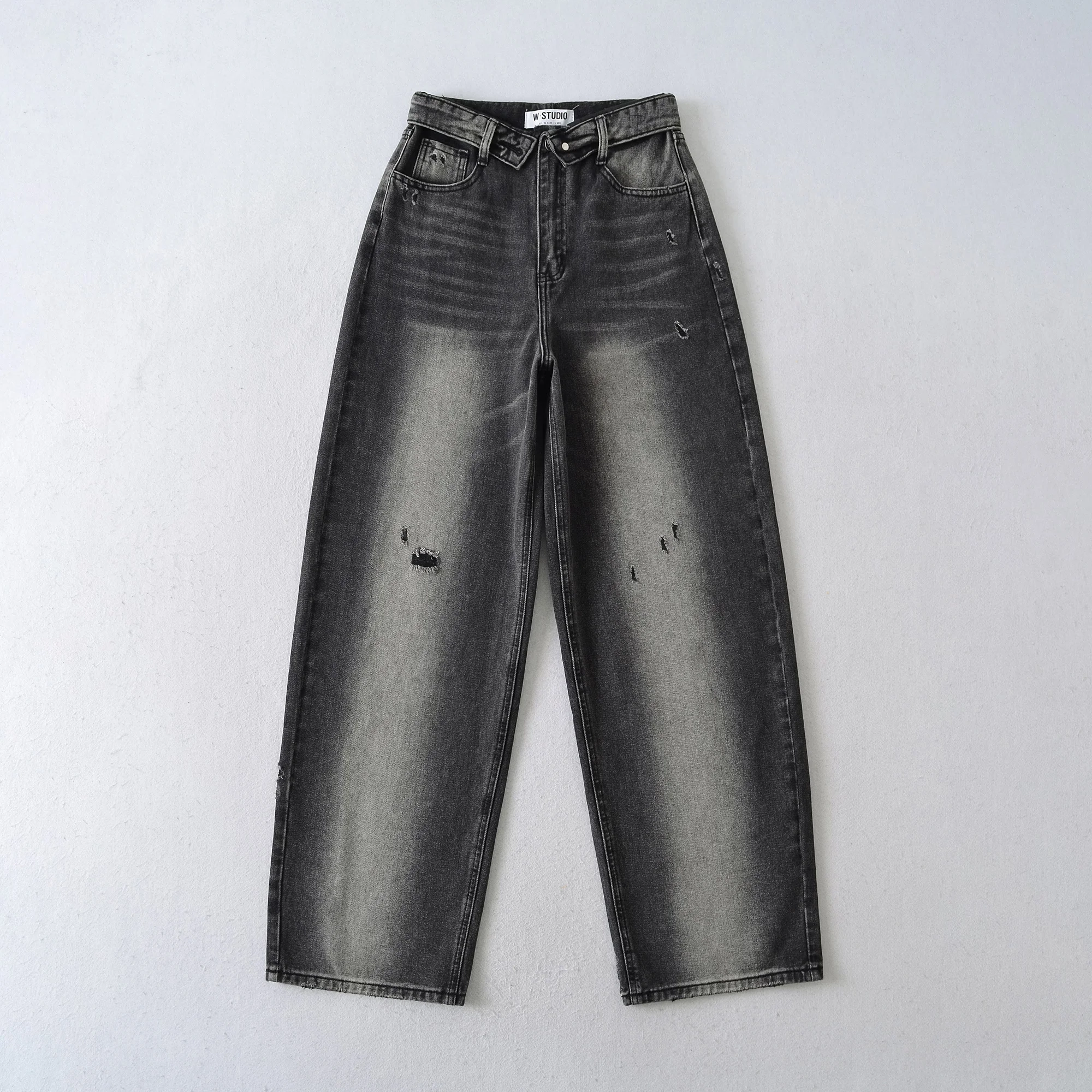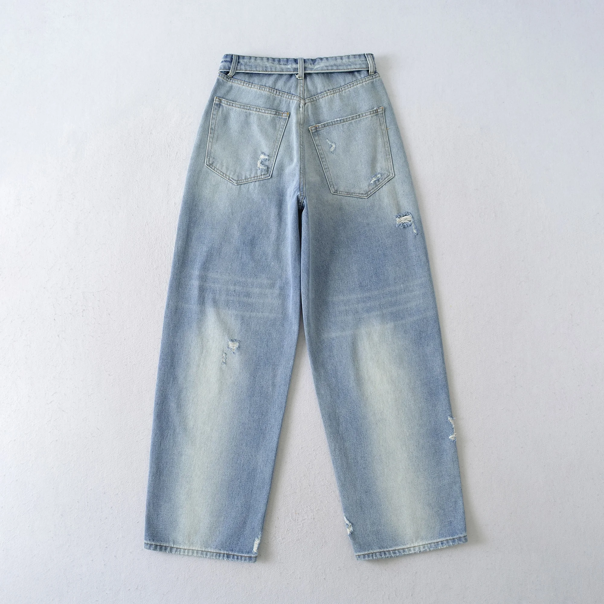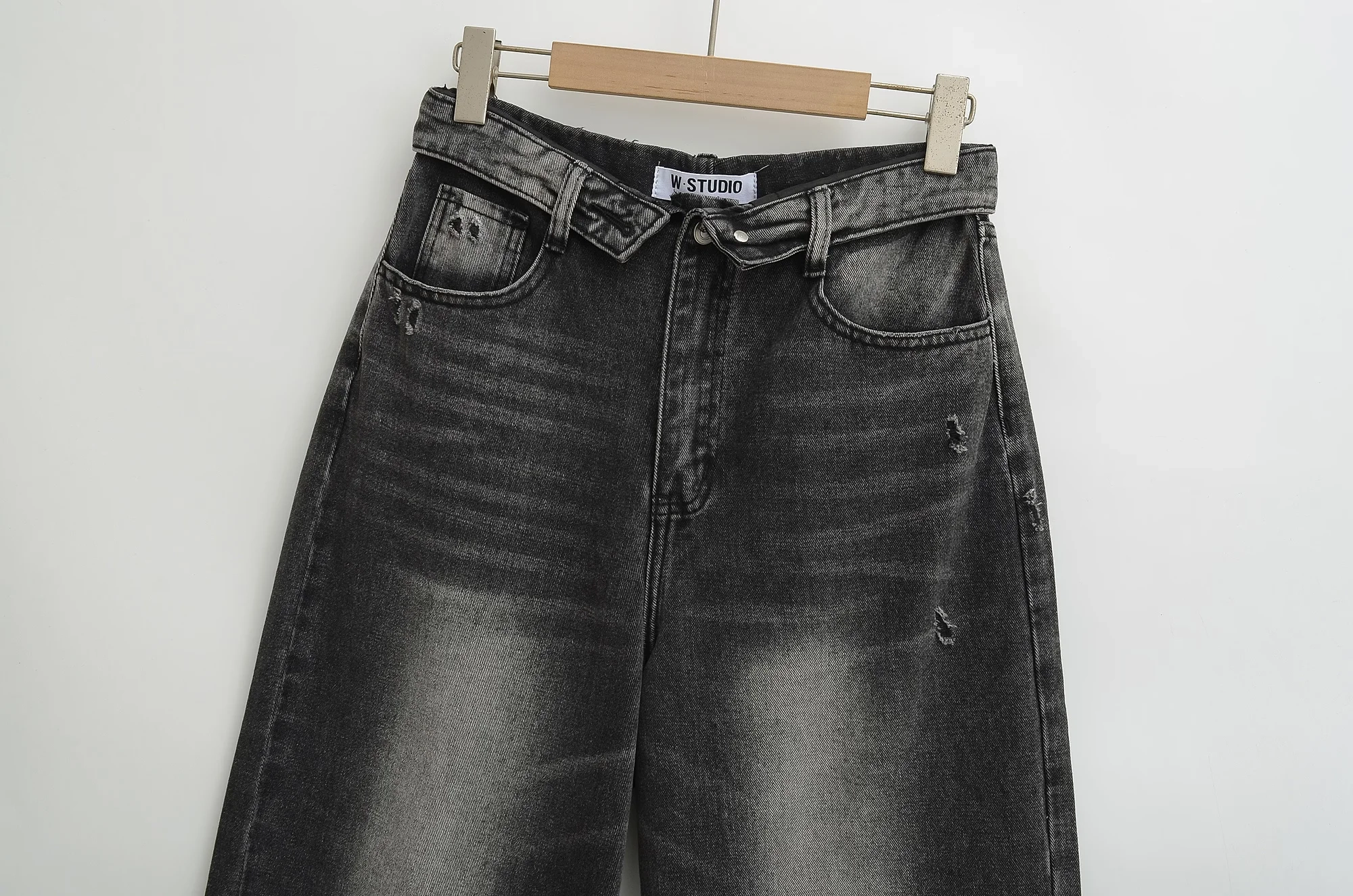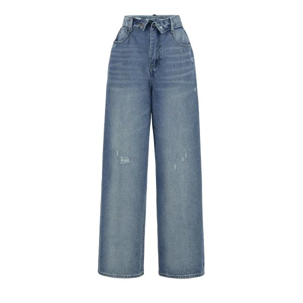 Women’s High-Waisted Flared Wide-Leg Denim Pants Long Jeans Hole Design & Back Pockets, 3 Colors